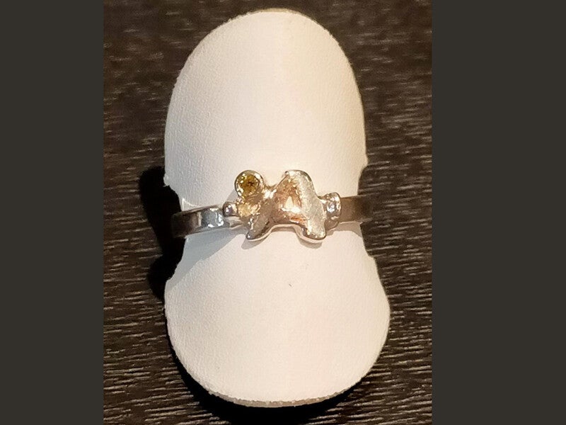 Zilveren handgemaakte ring met letter en gekleurde zirkonia.