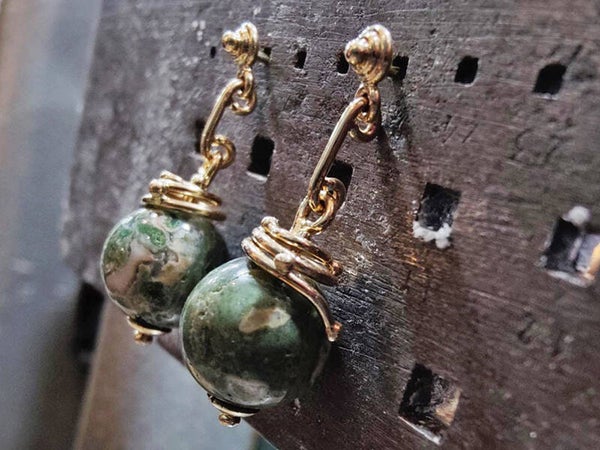 14 krt. Geelgouden handgemaakte oorhangers met jaspis. De bewerkte knop met steker zit op het oor, de bolle / ronde stenen bungelen mooi eronder. Deze speels gevlekte stenen hebben overwegend de kleur groen.